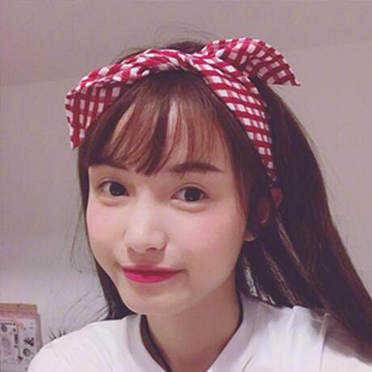 B343林小宅 紅色格子拷邊布藝髮帶 日系軟妹百搭兔耳朵蝴蝶結頭帶Plaid