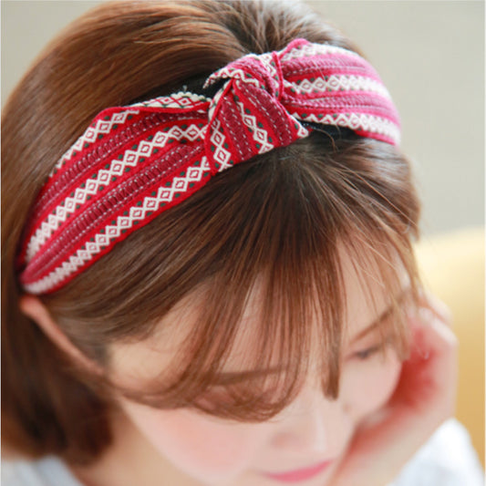 B503韓國頭飾復古波西米亞圖騰刺繡民族風打結髮箍歐美彈力髮帶Ribbon