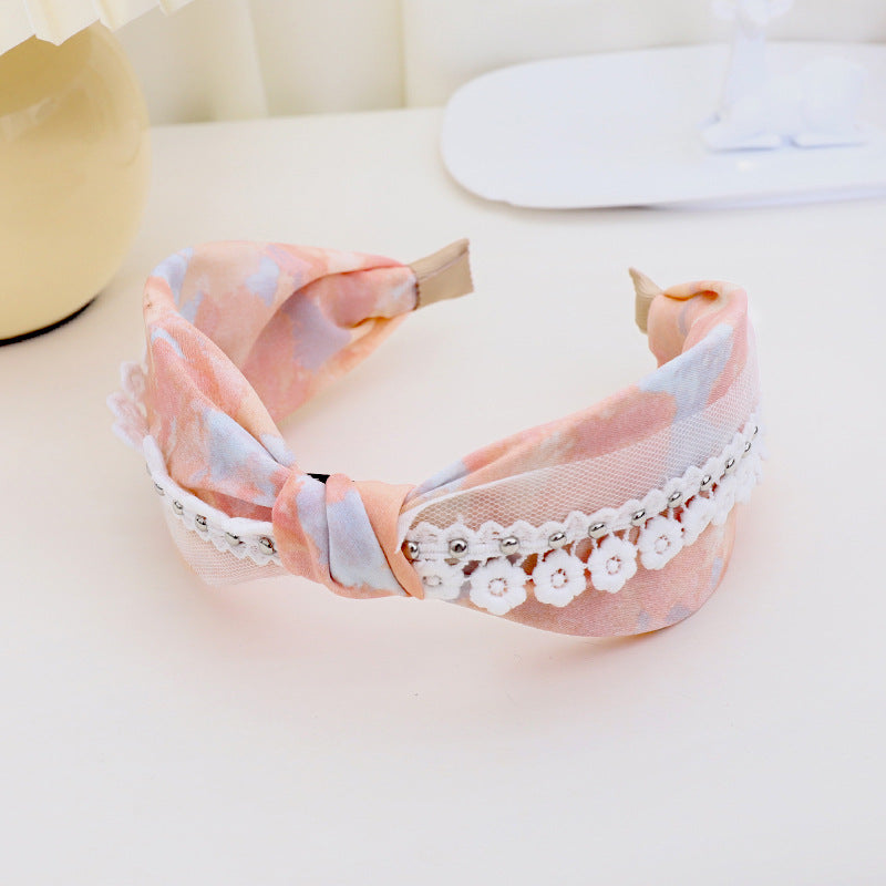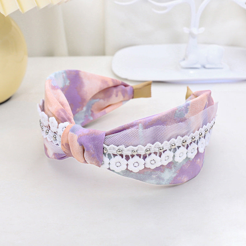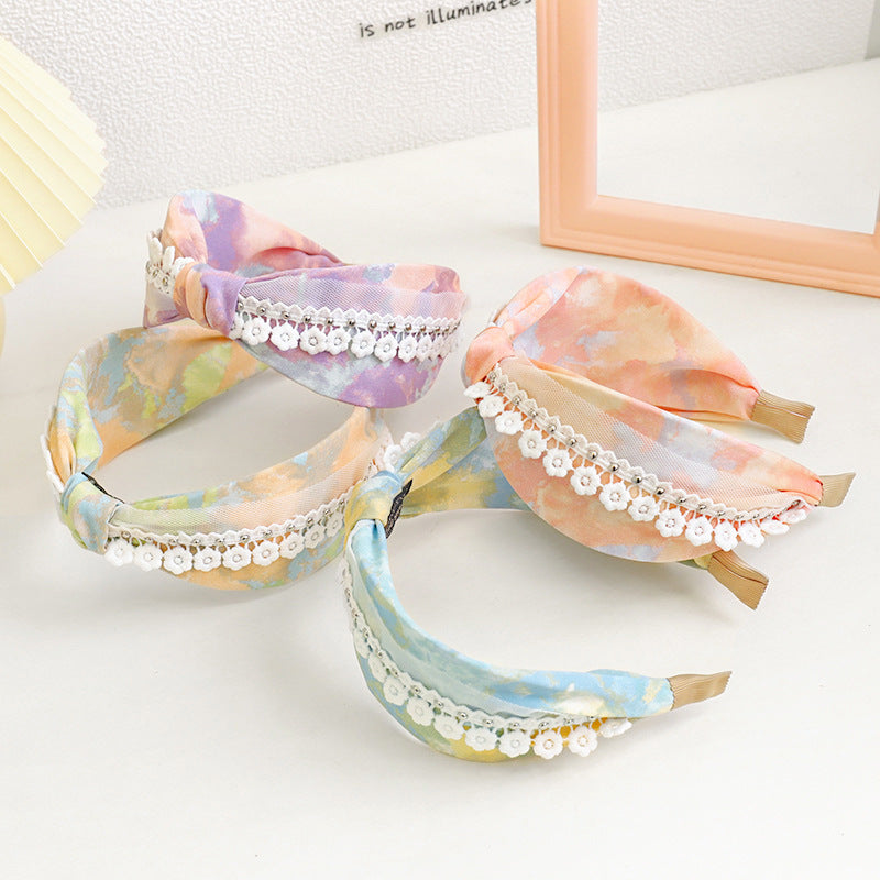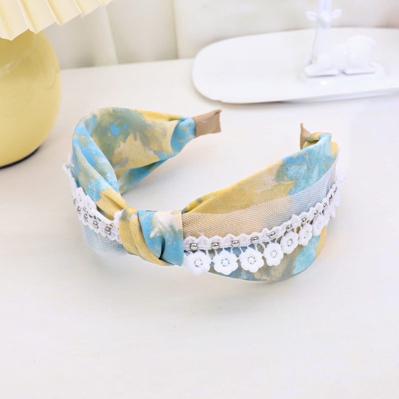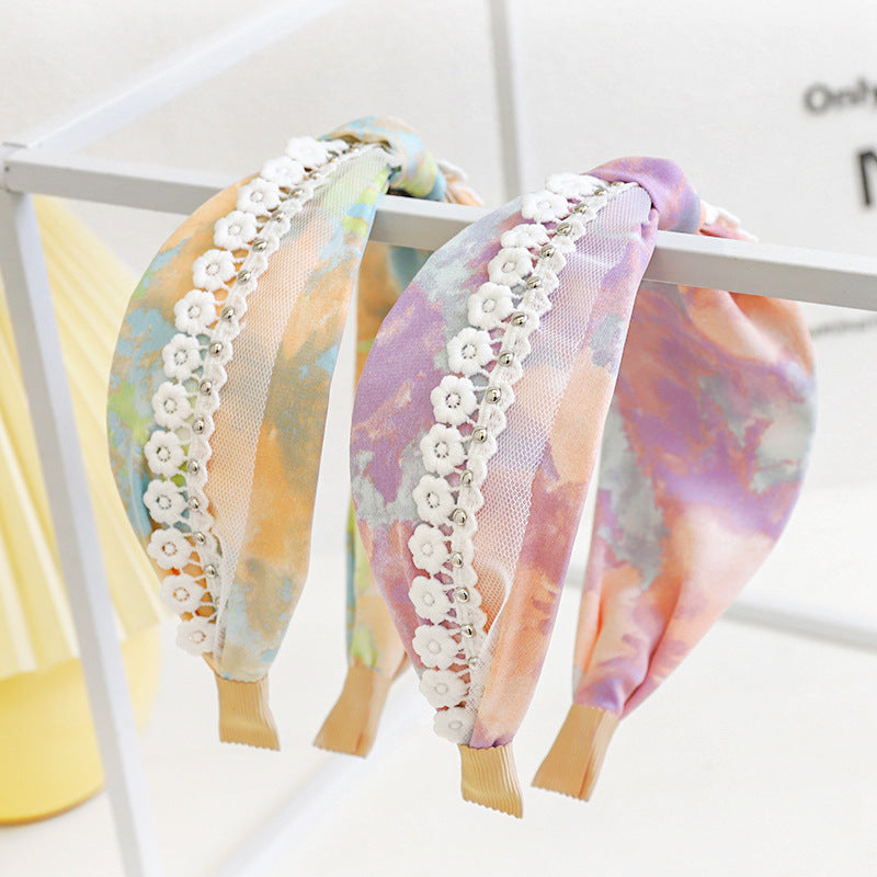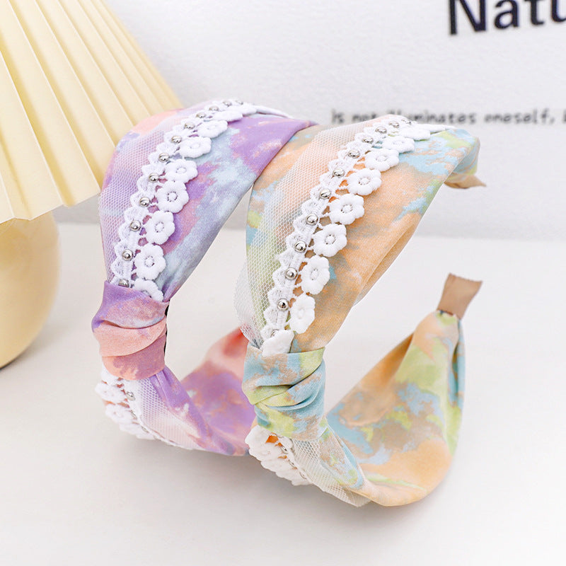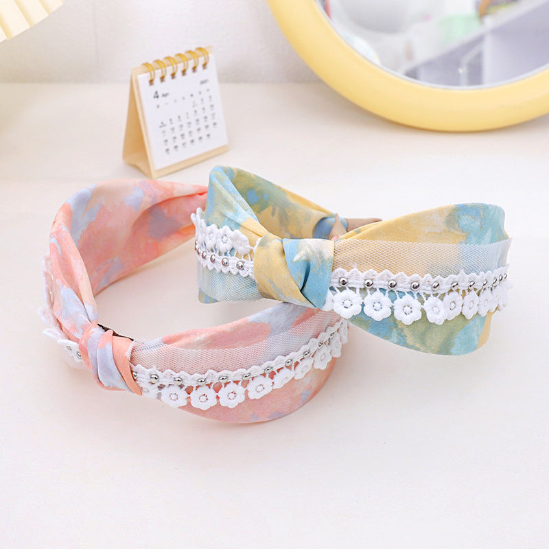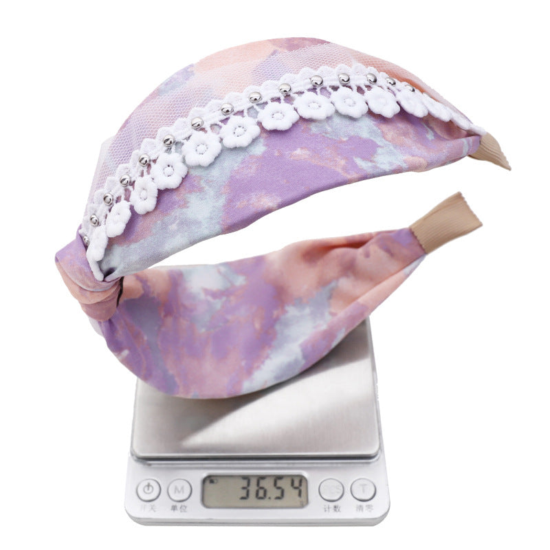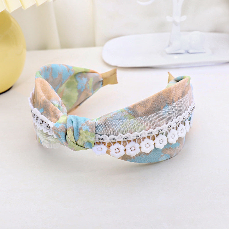 F461春夏新品发箍印花扎染布艺钉花边网纱发饰头箍中间打结女发捆hh202104