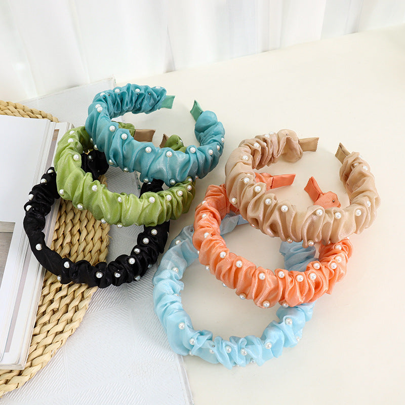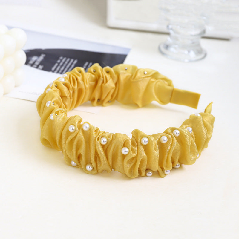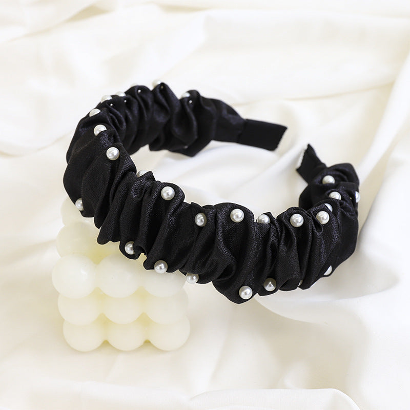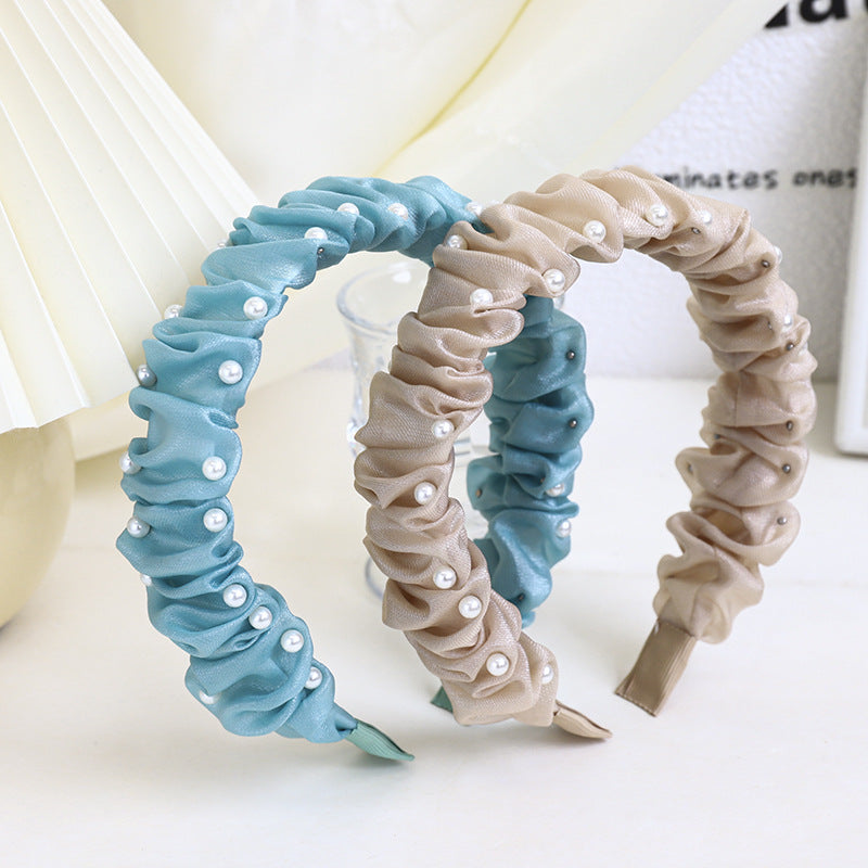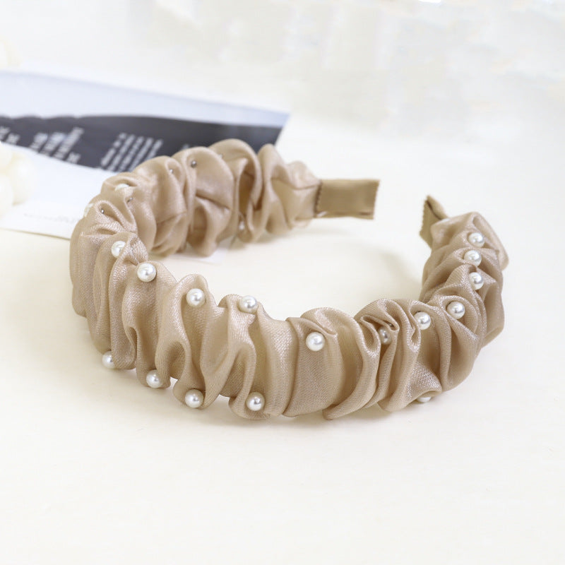 F469韩版新品发箍简约纯色亮丝布艺头饰发捆时尚钉珍珠褶邹女头箍hh202104