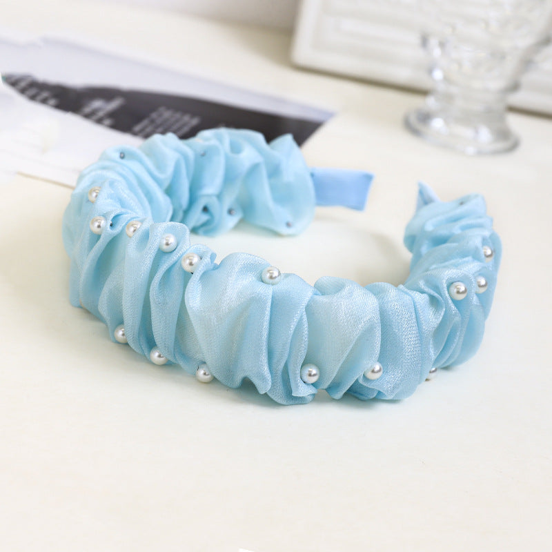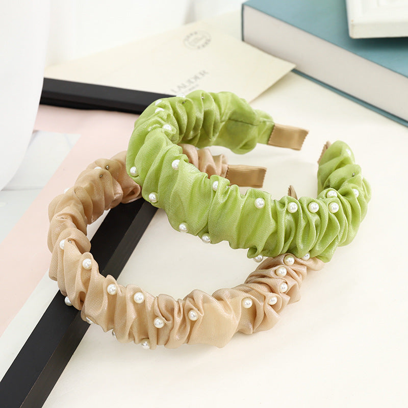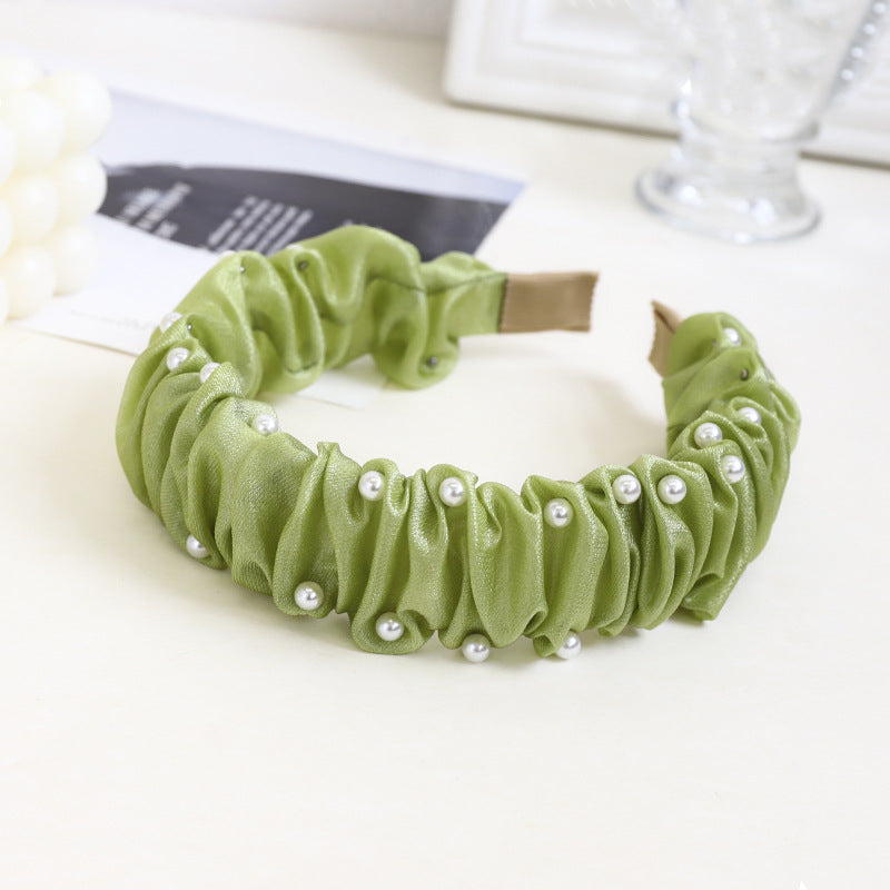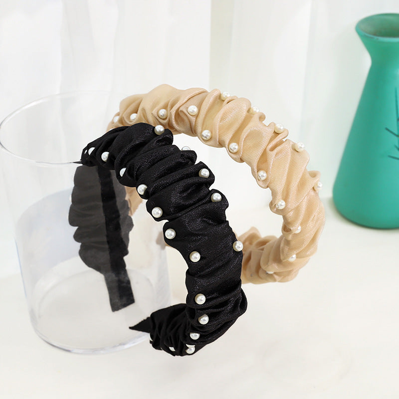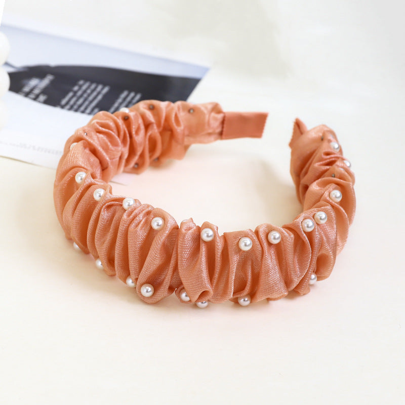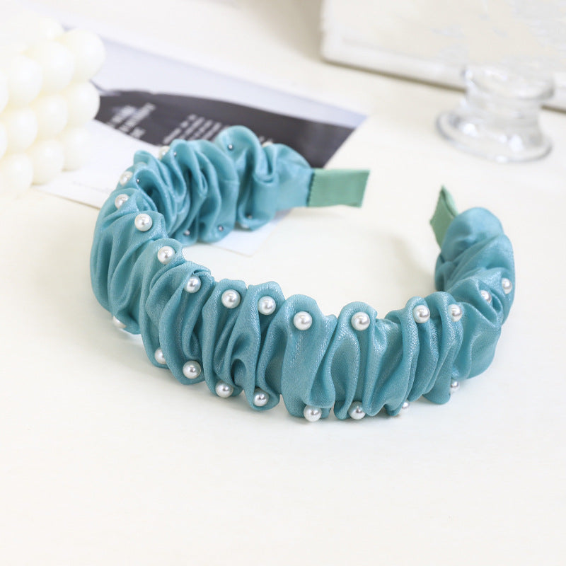 F469韩版新品发箍简约纯色亮丝布艺头饰发捆时尚钉珍珠褶邹女头箍hh202104