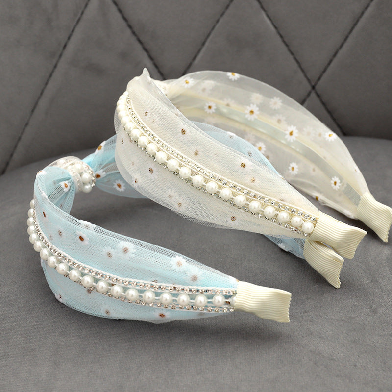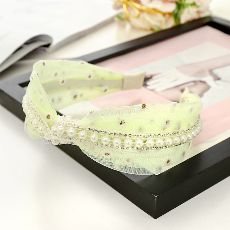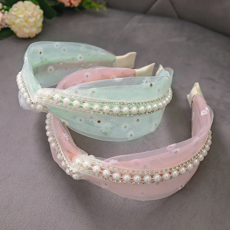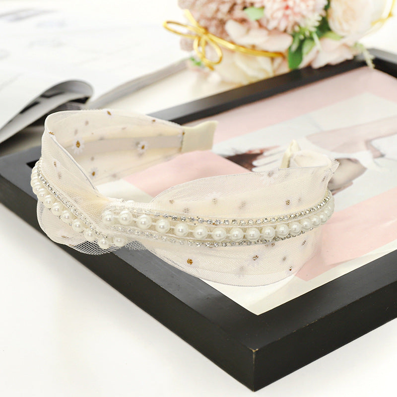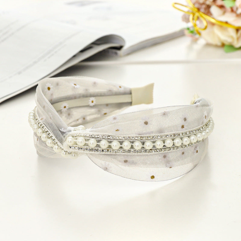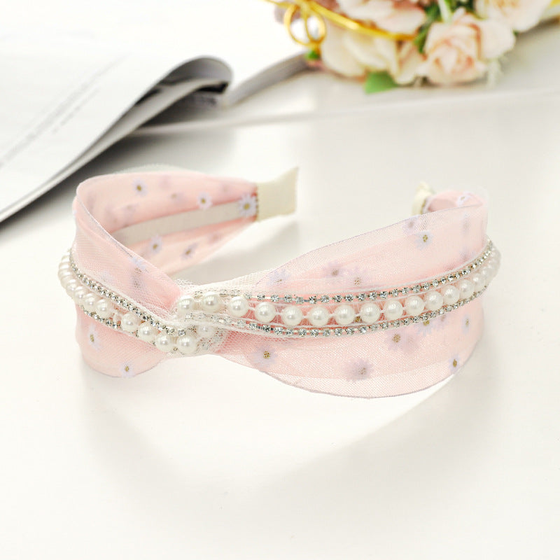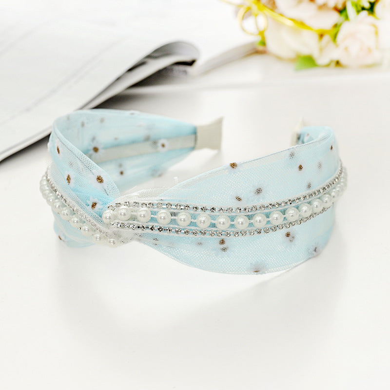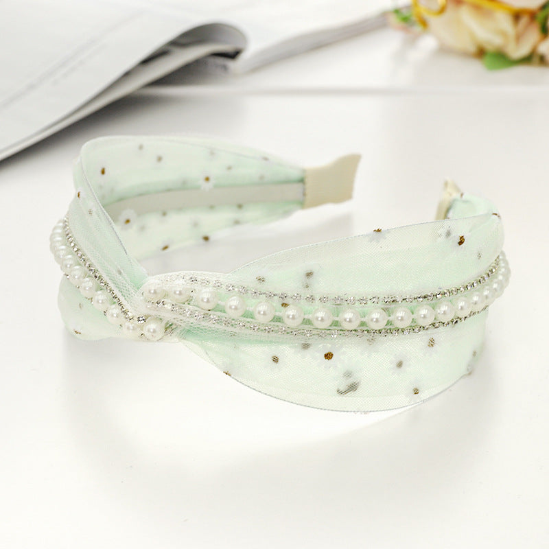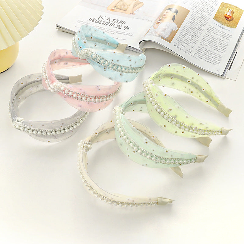 F544跨境夏季新款韓版發飾髮卡純色網紗珍珠亮鉆交叉女士洗臉髮箍YC20210920
