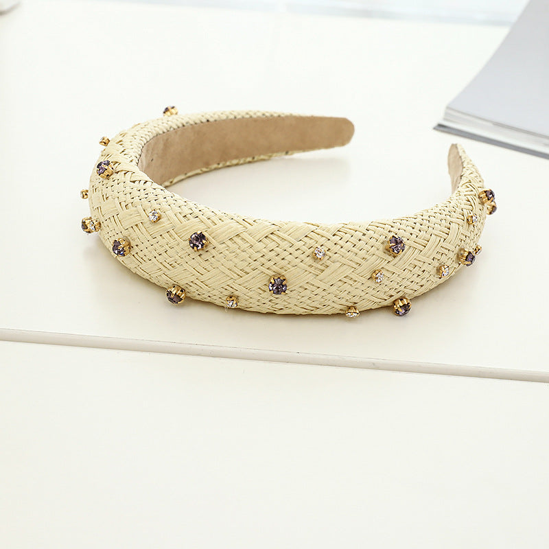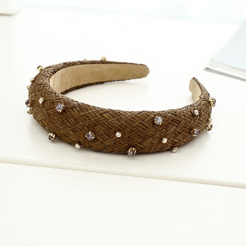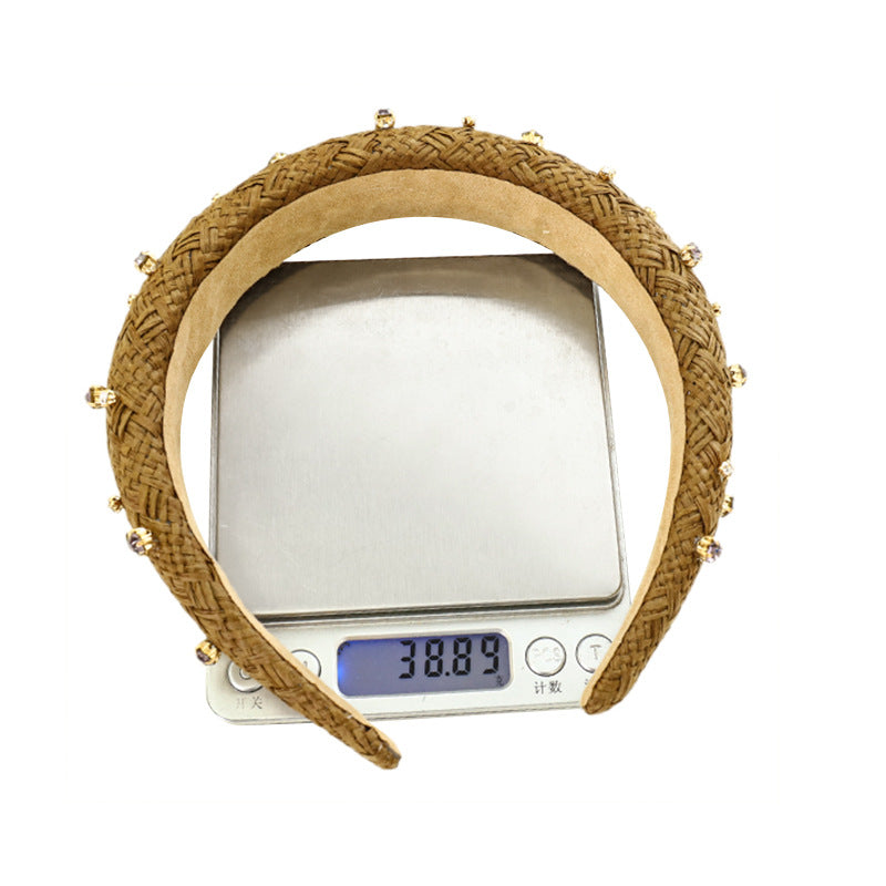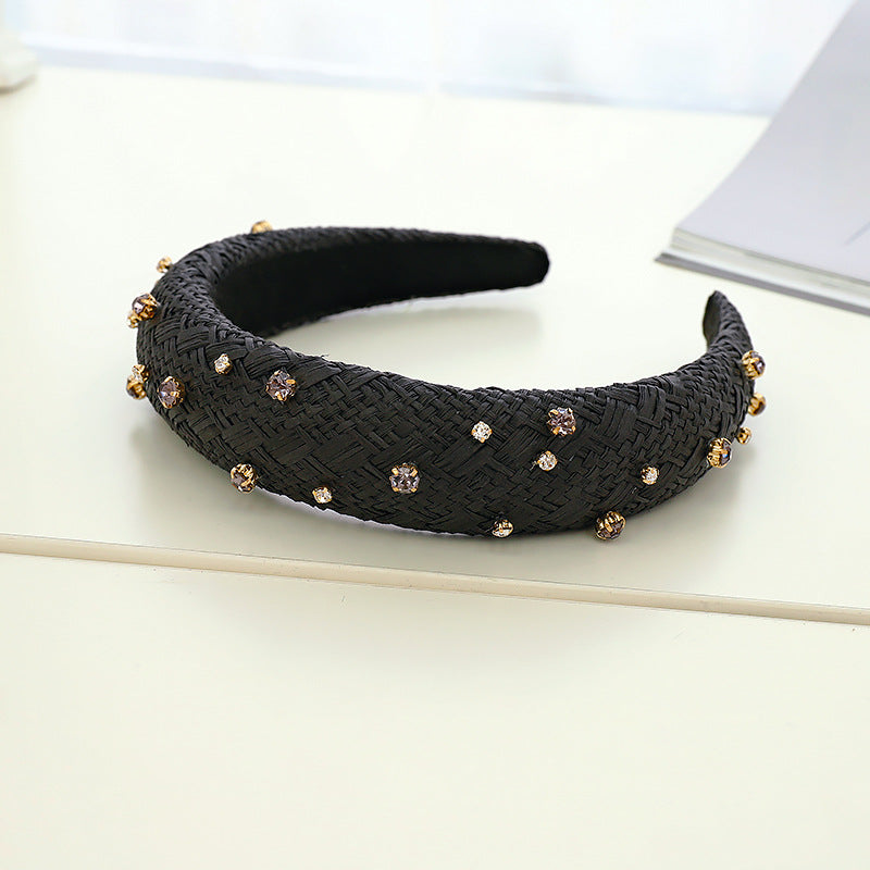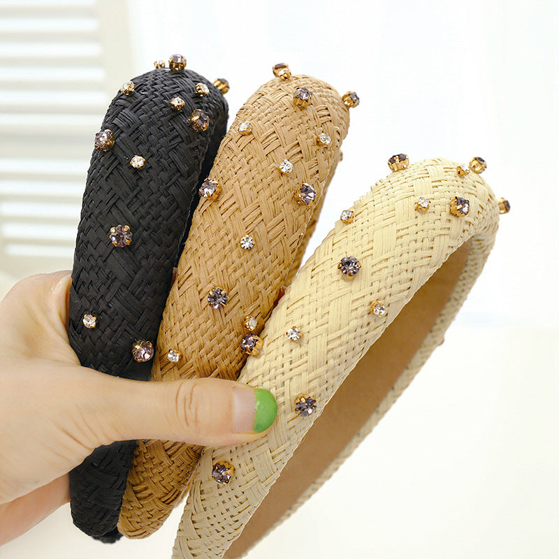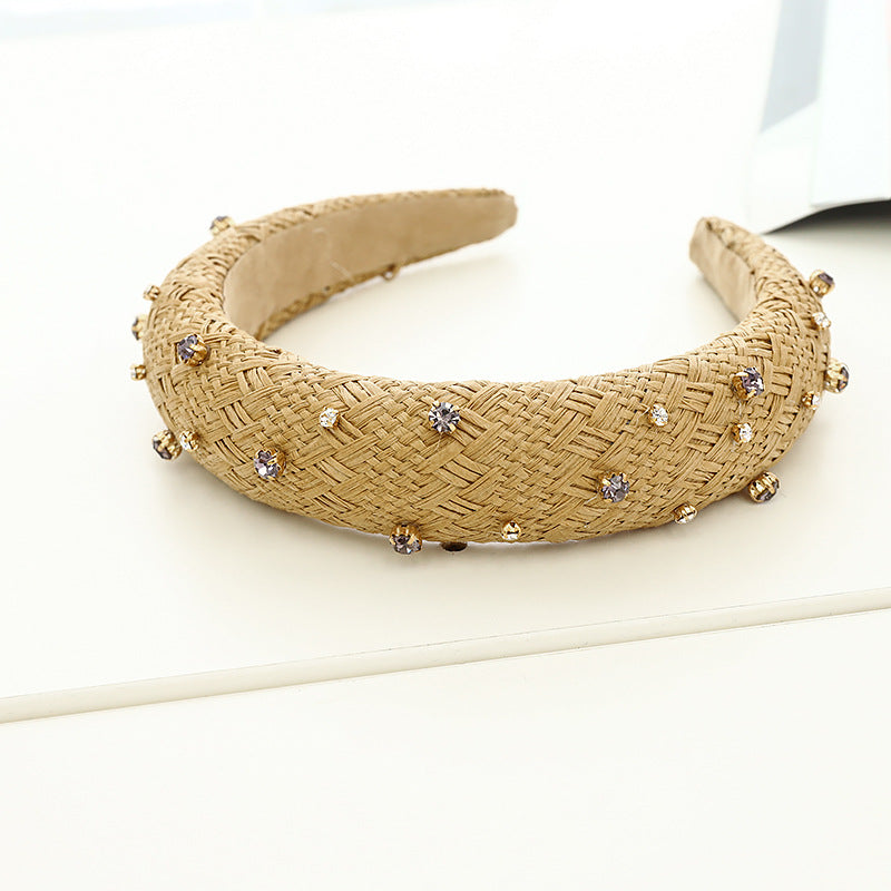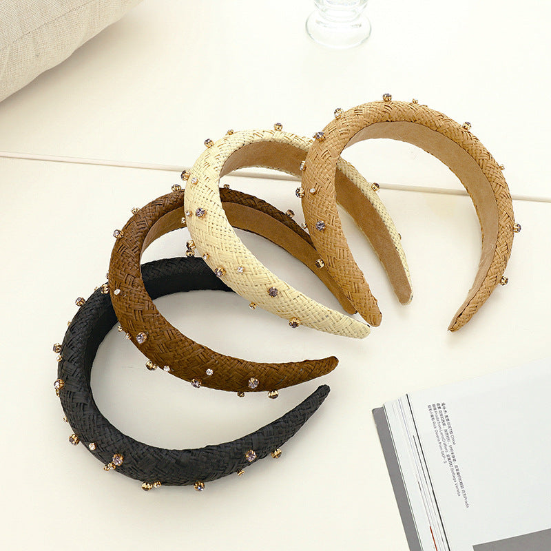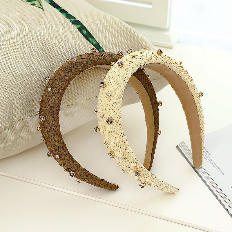 R231跨境新款編織拉菲草寬邊頭箍韓國網紅同款草編釘亮鉆頭飾髮箍YC20210916